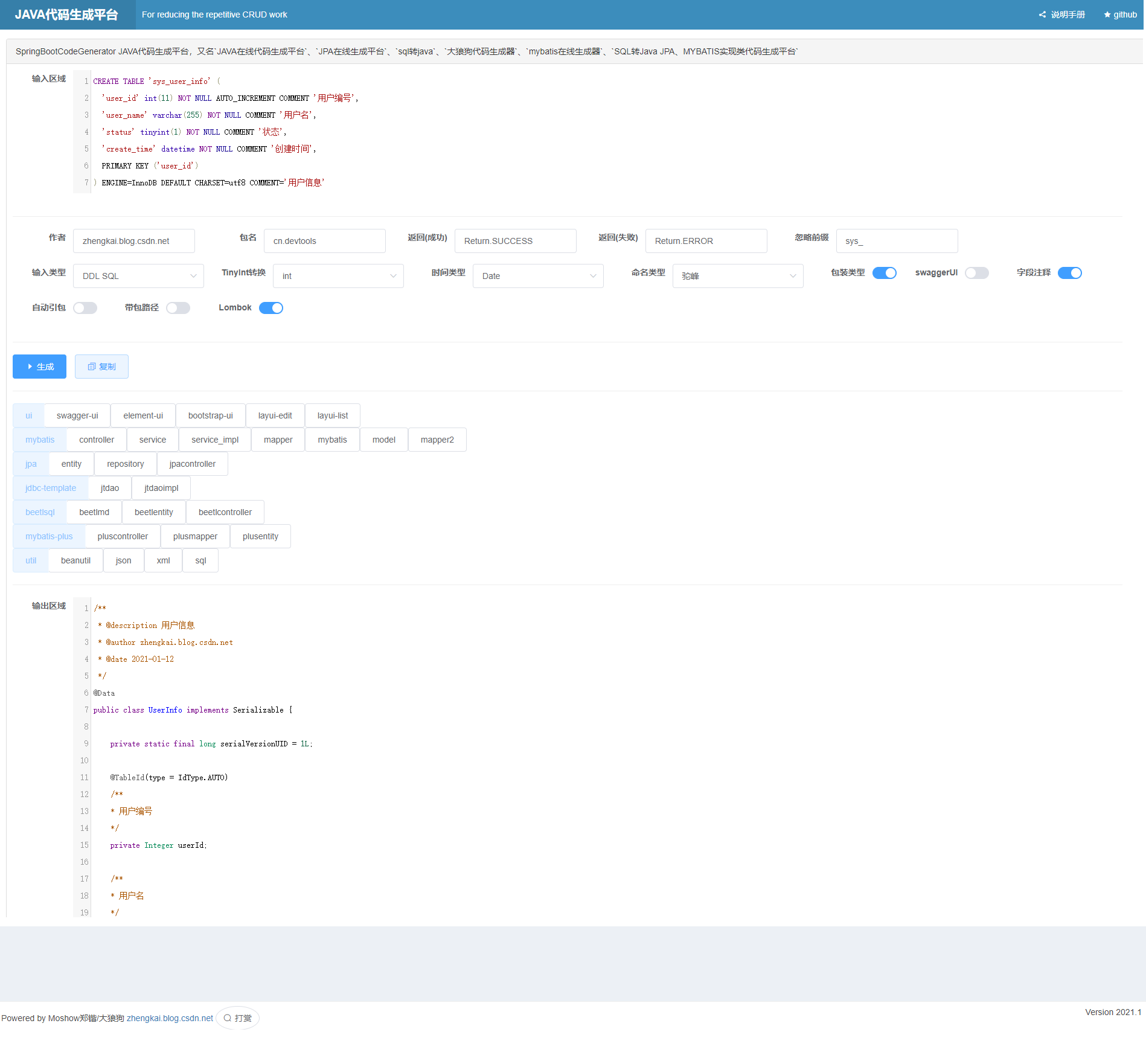 又名JAVA在线代码生成平台、sql转java、大狼狗代码生成器、mybatis在线生成器、SQL转Java JPA、MYBATIS实现类代码生成平台